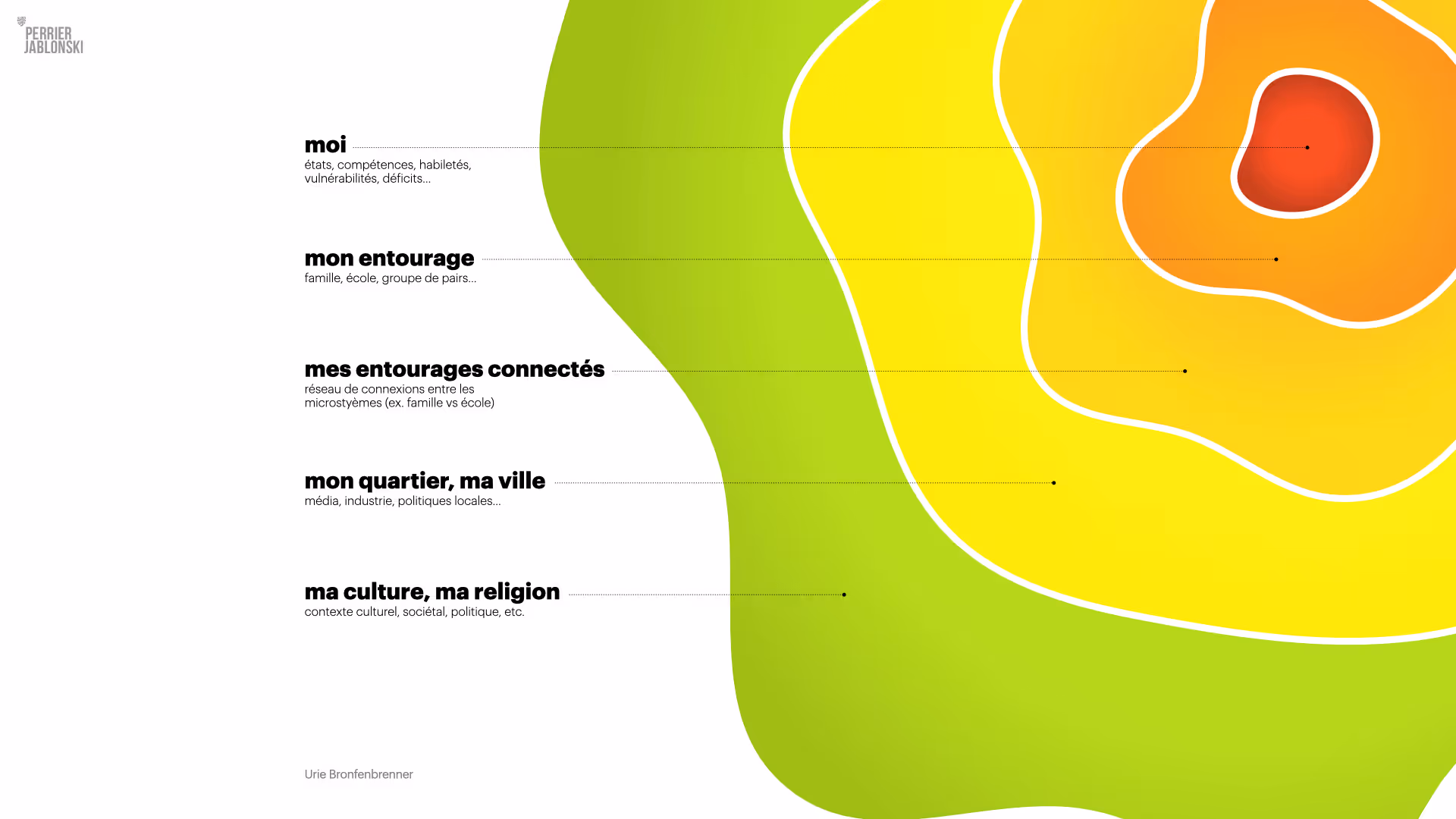 Le modèle écologique du développement humain formulé par le psychologue américain d’origine russe, Urie Bronfenbrenner, dans les années 70, propose d’étudier le développement d’une personne par l’entremise de ses interactions avec l’environnement. Cette théorie accorde une grande importance aux relations et aux changements, ainsi qu’aux pressions qu’exerce l’environnement sur une personne et vice-versa. Une analyse conduite à partir de ce modèle permettra de faciliter les transitions, favoriser l’adaptation à de nouvelles situations, encourager la prise de décision éclairée, apprendre à reconnaître ses biais, gérer les risques, planifier une intervention, etc.